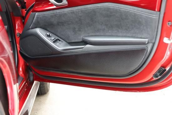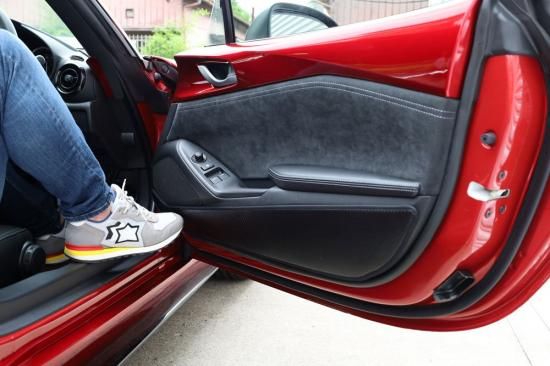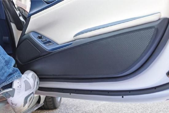 乗降時に汚れやキズがつきやすい車内のフロントドア内張りをスタイリッシュに保護するドアパネルキックガード。